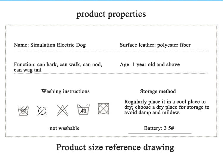 Delight kids with this interactive simulation electric dog toy πΆπ€. Controlled by voice and touch, it can bark, walk, nod, wag its tail, and play music β making it a fun and educational companion. Made of soft plush with safe electronic components, itβs perfect as a gift for children and pet lovers alike. Requires 3 AA batteries (not included).